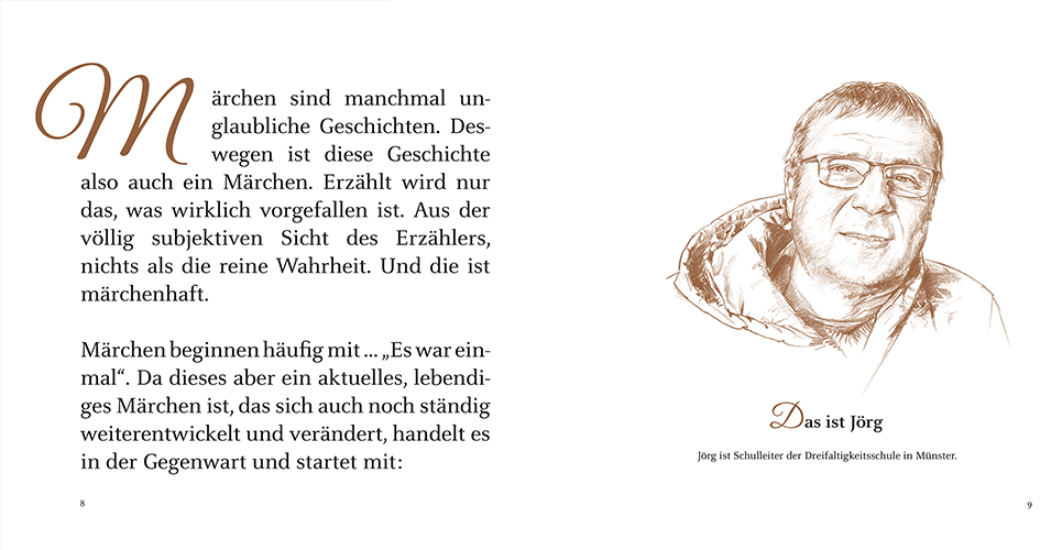 „Märchen sind manchmal unglaubliche Geschichten. Deswegen ist diese Geschichte also auch ein Märchen. Erzählt wird nur das, was wirklich vorgefallen ist. Aus der völlig subjektiven Sicht des Erzählers, nichts als die reine Wahrheit. Und die ist märchenhaft ...“ So beginnt dieses kleine Büchlein, welches ich für die Dreifaltigkeitsschule in Münster aufgebaut habe. Im Stil eines Märchenbuchs, mit Fotos und Illustrationen, erzählt es die Entstehung einer „Schulfarm“, die im Lehrplan der Schule mittlerweile fest integriert ist.